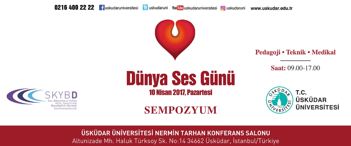 Bu yıl 10 Nisan 2017 pazartesi günü Üsküdar Üniversitesi Altunizade Yerleşkesi Nermin Tarhan Konferans salonunda düzenleyeceğimiz sempozyumda, “Profesyonel Sesin Eğitimini, Korunmasını ve Tedavisini” bilim insanları ve ses profesyonelleri ile değerlendiriyoruz. Sempozyumda konuk konuşmacılar sesin sahnede doğru kullanımı, sesin eğitimde ve meslekte önemi ve profesyonel ses kullanıcılarının hastalık ile karşılaşıldıklarında yapması gerekenler gibi önemli konulara ilişkin görüşlerini paylaşacaklar.